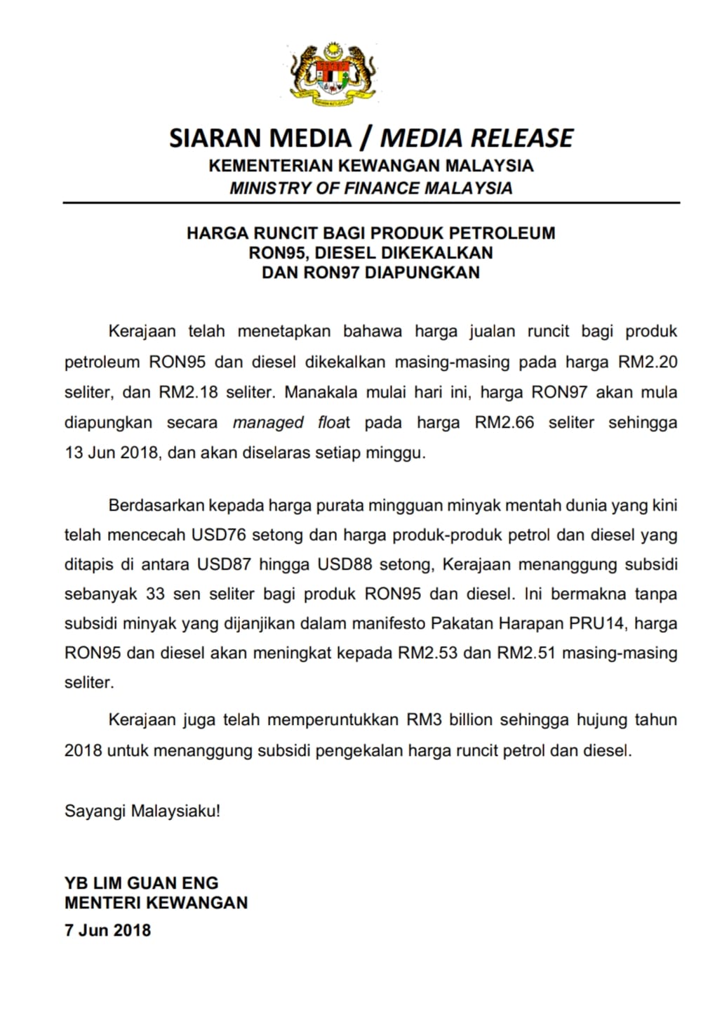 Astro Radio News on Twitter: ".@MOFmalaysia says #RON95 and